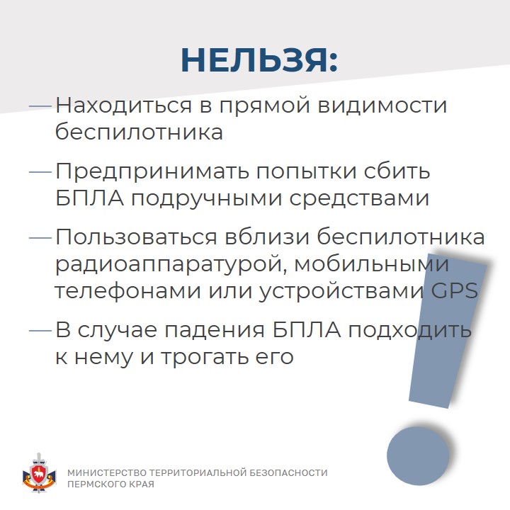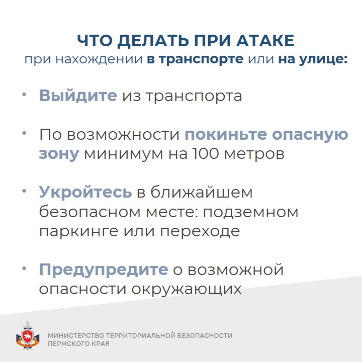 Внимательно изучите информацию о том, как правильно вести себя в различных ситуациях в случае возможных атак беспилотников. На данный момент угроз нет, работа по обеспечению безопасности и целостности региона ведется в штатном режиме.